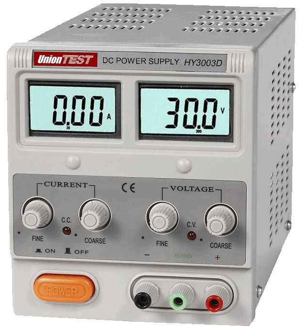 UnionTest HY3003D (прежнее название Mastech HY3003D) – источник питания, позволяющий получать регулируемое, точное и стабильное постоянное напряжение или постоянный ток. Две пары регуляторов грубой и точной настройки облегчают установку напряжения и тока, а цифровые жидкокристаллические индикаторы тока и напряжения упрощают считывание параметров выхода.