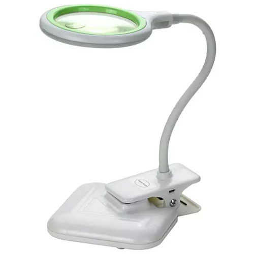 Портативный настольный светильник ALL-6597 оснащен светодиодной подсветкой с возможностью выбора цветовой температуры: теплый или холодный белый цвет. Для наблюдения различных предметов применяется основная линза с 3-х кратным увеличением, а для более детального рассмотрения можно использовать дополнительную линзу с увеличением 12X. Светильник можно установить как на подставке, так и прикрепить к столу при помощи прищепки-зажима. Питание производится от USB порта.