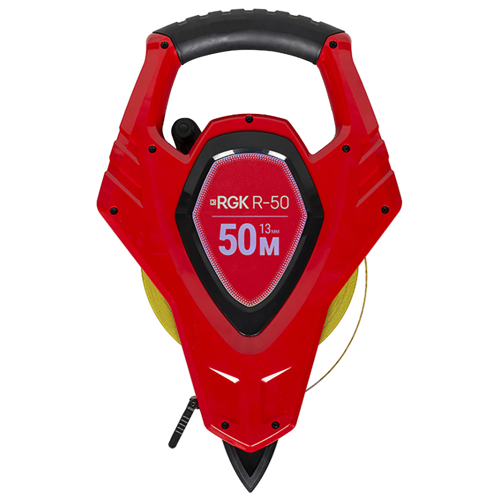 Измерительная рулетка RGK R-50 длиной 50 метров выполнена в открытом корпусе и снабжена механизмом ускоренного сматывания ленты. Нейлоновое покрытие ленты защищает ее от истирания.